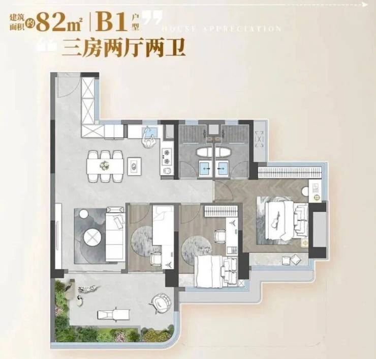82㎡偶数层户型:同样是3房2卫,四开间朝南,南向面宽约12.4米。空中花园面积更大,有24㎡,实用率约131%,实用空间约110㎡。LDK一体化空间,开放式厨房设计,可打造有岛台,直连餐厅,约20㎡竖厅布局,亦可实现约34㎡L型超级大方厅灵活布局。
