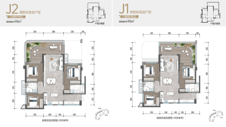 建面95㎡户型偶数层户型偶数层的露台花园露台主要为卧室空间的延伸,也能与客厅直接相连,面积约为12㎡,强化了休闲功能,为夏夜纳凉、闲时读书等静态活动提供了理想的空间。