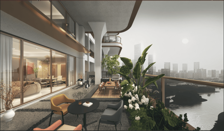 为了采光,外围阳台的进深都控制在3-4米,多采用增加阳台面宽的方式,且做到了6米通高,既满足了“大阳台”的面积,又能保证透过阳台、室内空间有充足的采光。
