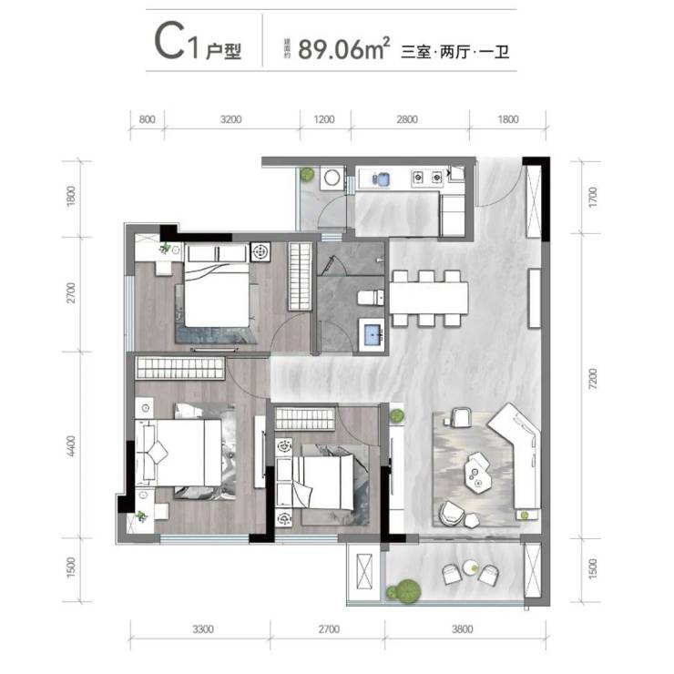 建面约100㎡户型产品,三室两厅两卫,四面宽朝南,约15.6米的采光面,三个卧室全部为南向卧室,实现居住平权。约6.6米的宽厅设计,让生活更加丰富多彩。