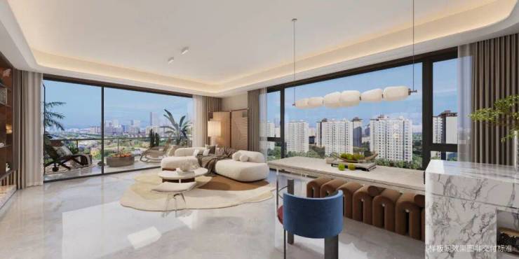 也即将露台上方的住户卧室进行封闭设计,为了弥补封闭墙体带来的采光影响,加大了客厅与露台之间的采光开口,客厅与露台之间的推拉门宽度可达到约4.6米-6米。