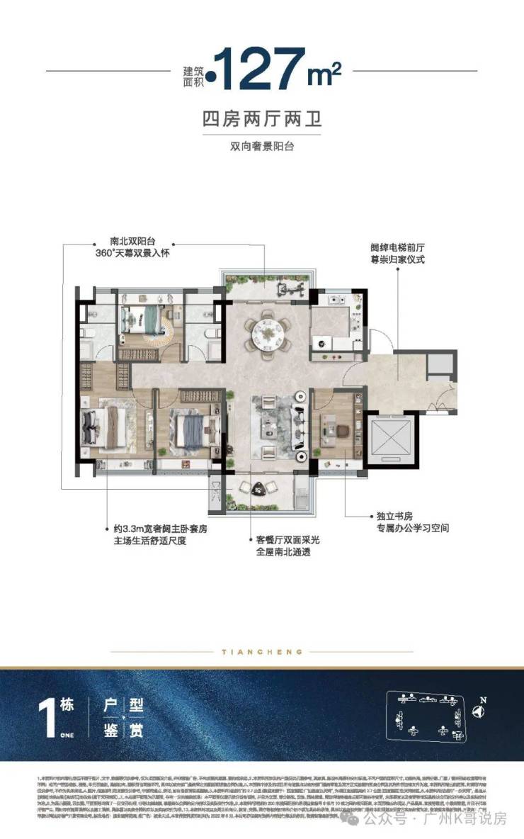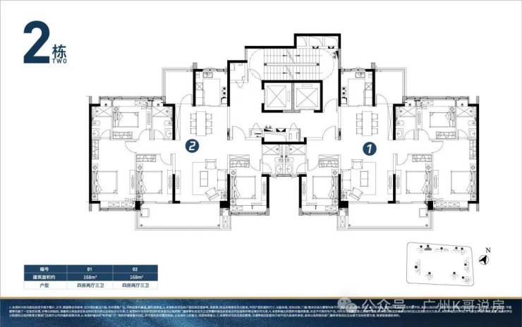 主推建面约104-168㎡全四房户型,两梯两户或两梯三户设计。
