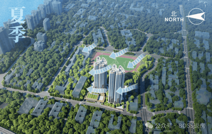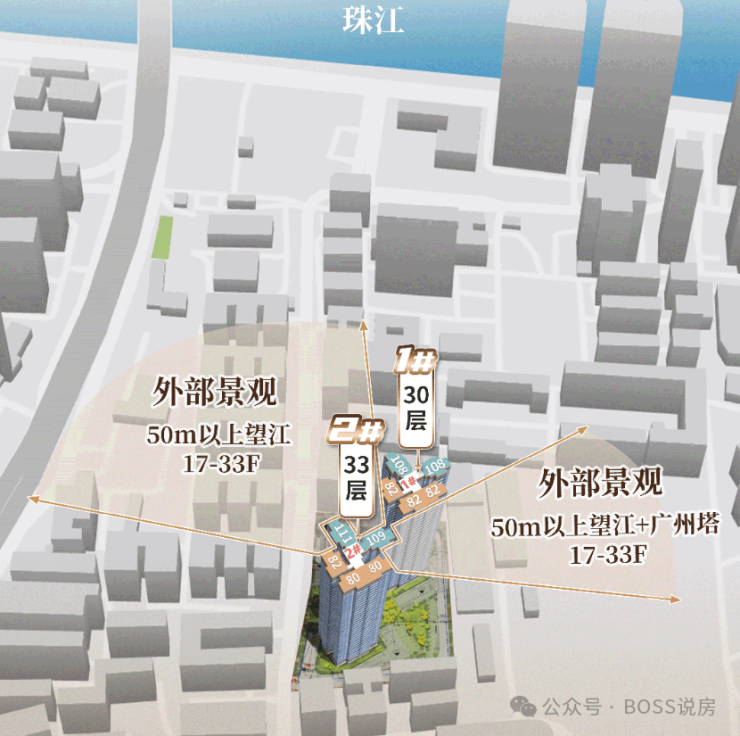 项目地块较小,由2栋30-33层的塔楼组成,楼栋通过扭转一定的角度,实现了户户朝南,实现约80%梯腿望江