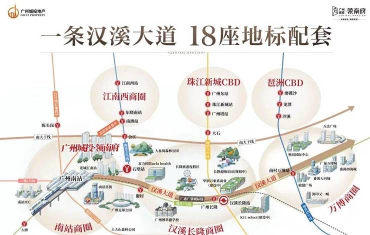 一条汉溪大道,串联南站商圈、江南西商圈、汉溪长隆商圈、珠江新城CBD、琶洲CBD和万博商圈,城市繁华便捷可享。