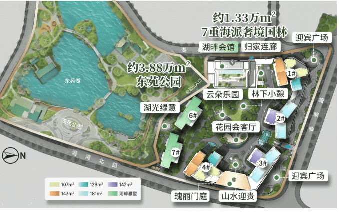 建面约142㎡的四房,做到约16米南向采光,站在约8米全景阳台,约1.2万㎡湖景扑面而来,高层还能望江。