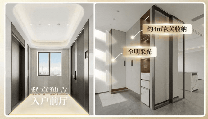 除了专属独立电梯厅,室内还打造有约4㎡的入户鞋帽间,形成“内外双玄关”的设计。