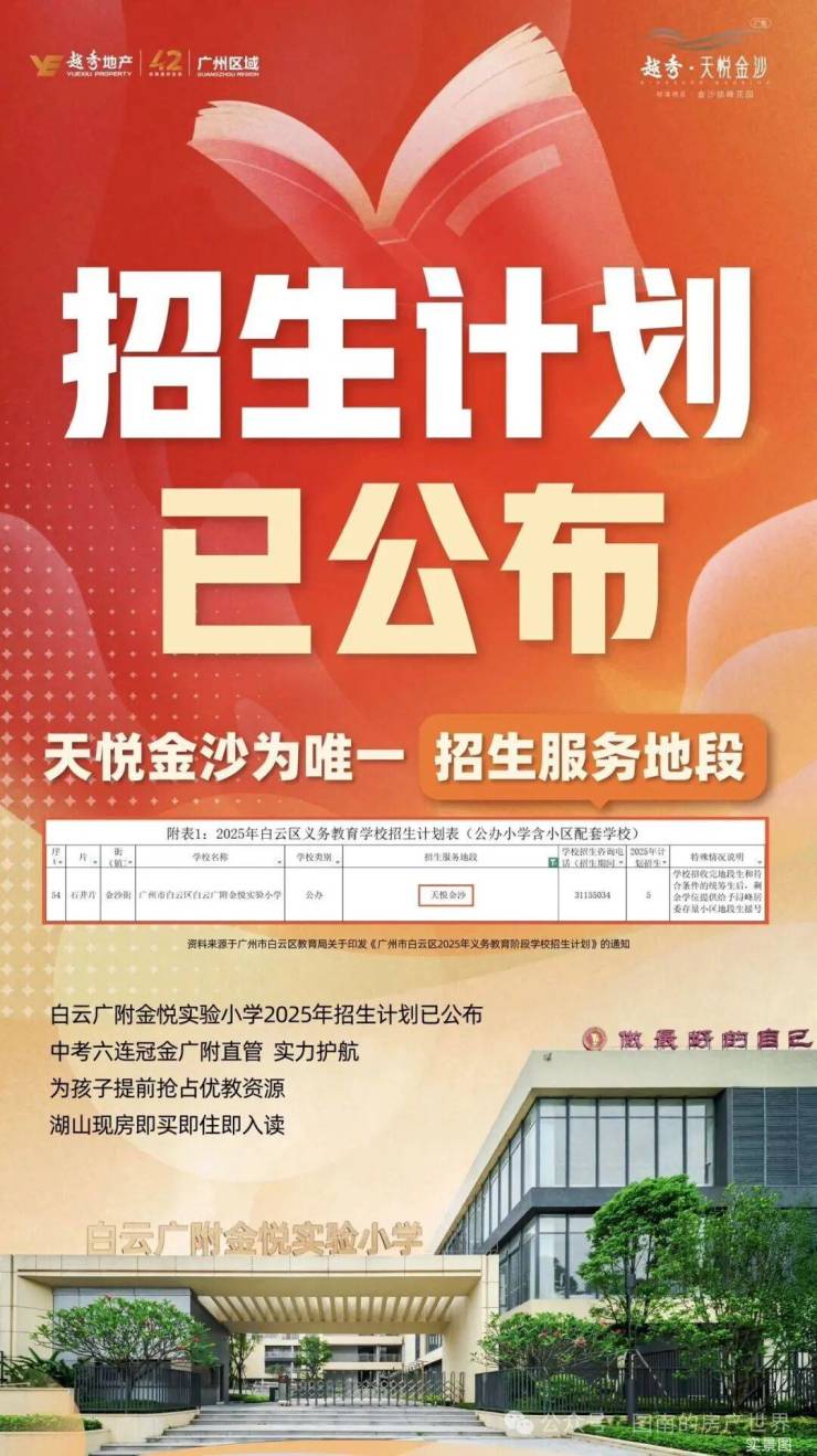 学校:18班幼儿园(预计今年9月开学)+30班白云广附金悦实验小学(已开学)