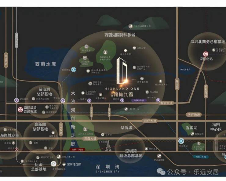 弘基朗寓所属西丽片区,分布有7所诺奖实验室、458个创新载体、以及囊括哈尔滨工业大学深圳校区、天津大学佐治亚理工深圳学院等九大高校的大学城,与南山区80%的院士为邻。弘基朗寓所处地块整体占地面积为8269.29㎡,总建面约8.6万㎡,地块主要由1栋A座31层办公楼及1栋B座15层公寓组成。