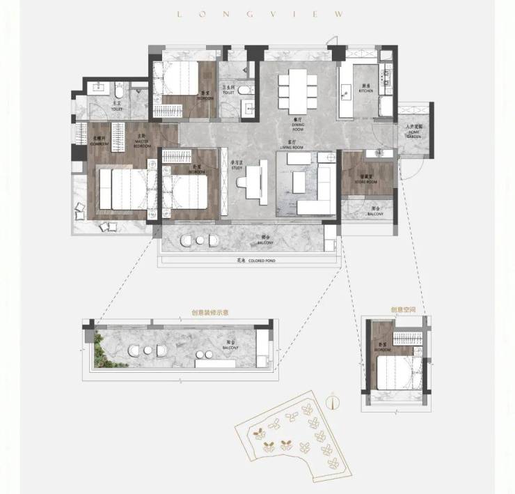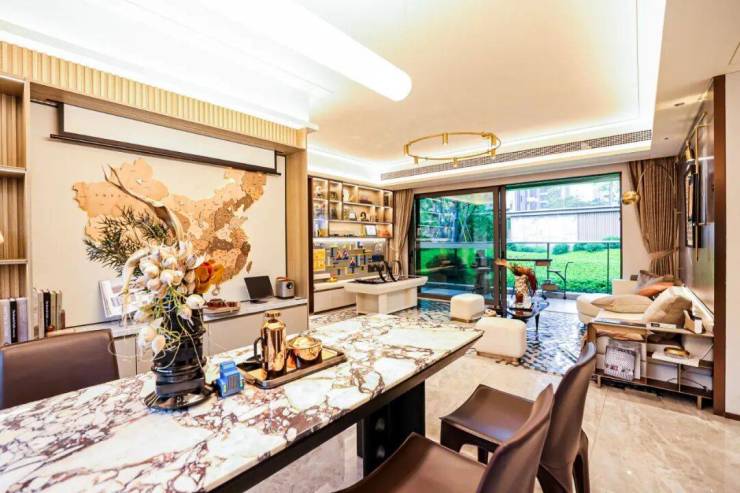 建面约182㎡四房两厅三卫,入门隐藏式储物柜;半开放式厨房,交互式客餐厨一体化,约13米环绕式景观阳台,270度imax 巨幕采光;约35㎡主套房,双飘窗+步入式衣帽间,堪比五星级酒店的居住体验。
