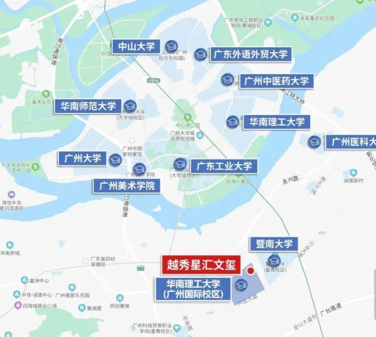 越秀星汇文玺项目西面是华工国际校区,东面是暨南大学番禺校区,北面则跨南大干线跟大学城一期相望。据统计,光是环绕在项目周边的知名学校就多达13所,无论人文气息或教育氛围,都妥妥儿的位于鄙视链顶端。