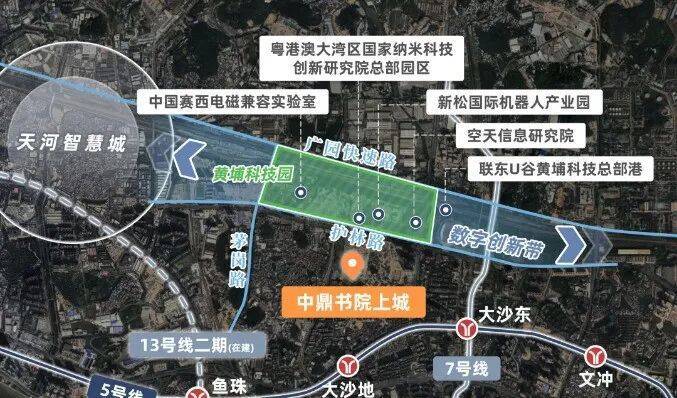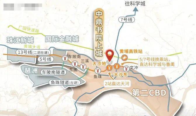 5号线大沙地站距离约800米,7号线二期大沙东站已开通,13号线裕丰围站也在规划之中,这三个地铁站都非常重要,构成了黄金3地铁交汇