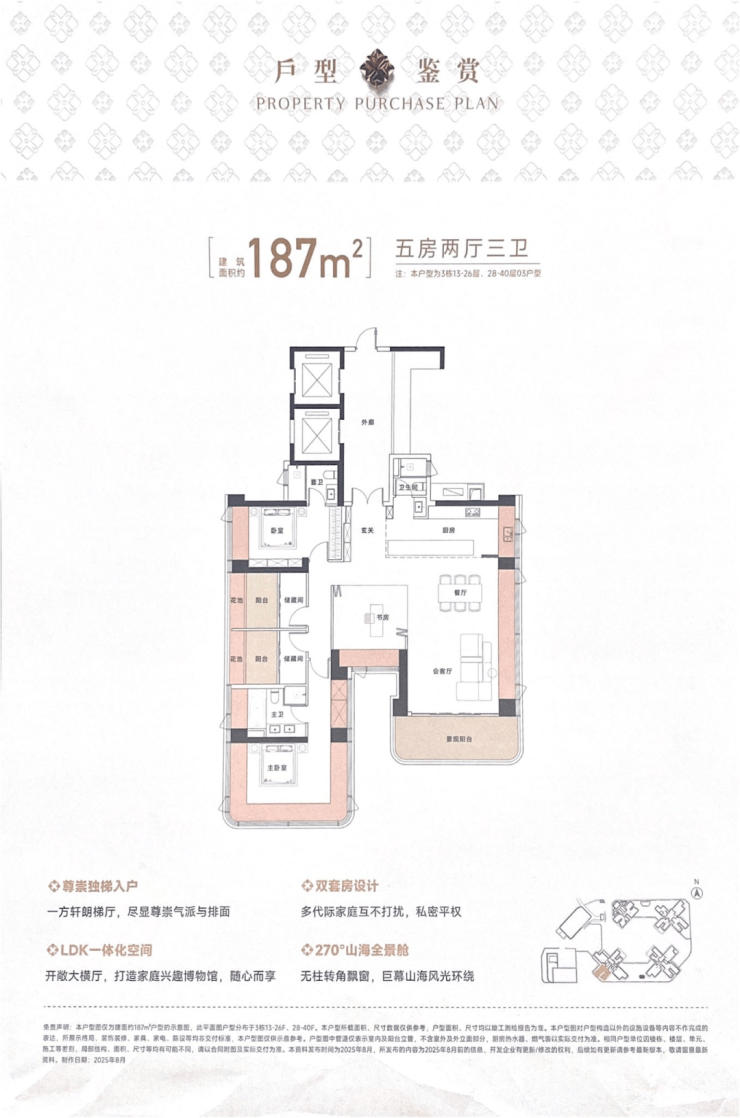 约187㎡五房两厅三卫:双梯一户,私家独享约28㎡电梯前厅。LDKB客餐厨一体化设计,进深超7.3米,约60㎡超级方厅,矜藏大家庭的幸福美满;
