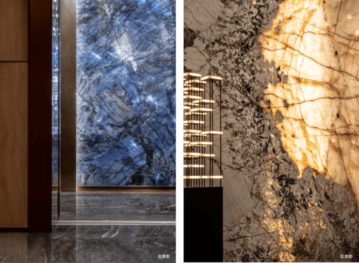 集全球奢石铺陈质感公区,文体中心及公区大堂地面/墙面大量采用巴西海浪石材,搭配马达加斯加蓝翡翠、潘多拉透光石、伊朗青玉等珍稀奢石。