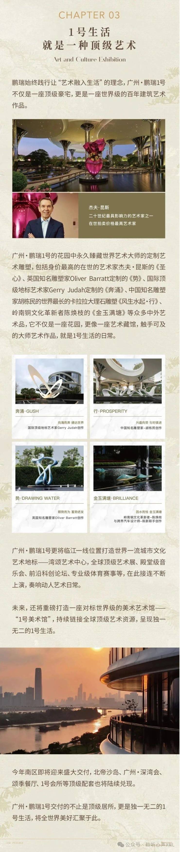 广州·鹏瑞1号,对标全球顶豪,凝结全球顶尖设计团队,打造“中国仅有、世界少有”的全球影响力地标综合体。涵盖顶级公寓、湾颂·艺术中心、高定奢尚商业、广州·深湾会、立体星空园林、世界级生态公园岛等全球独一无二的顶级配套。