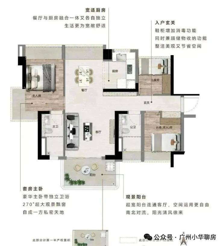 南北通透|主卧 270°飘窗+双飘窗|U 型厨房|南向观江景阳台
