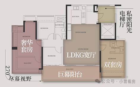 约8.4米南向巨幕阳台,主卧270°飘窗,能最大程度引园景入室。