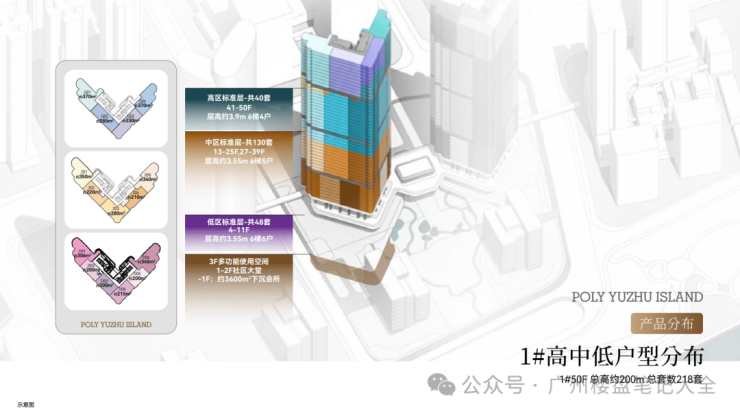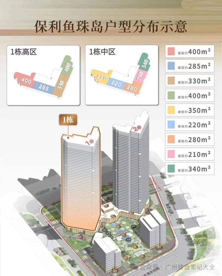 首推1栋大平层,户型为200-400㎡ 在规划上,保利鱼珠岛一共4栋建筑,1栋和2栋为大平层,大约是400多户。 首推的是1栋大平层,高50层,建筑面积大概分为200-300-400平。