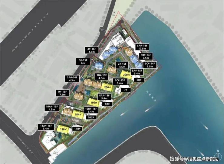 由于临近军区的原因,所以朝向不是正南,而是偏西南,小区设计南低北高,东侧的临河位置由于限高15米,做了5栋4层高叠墅,西侧也是小高层15-16层设计。