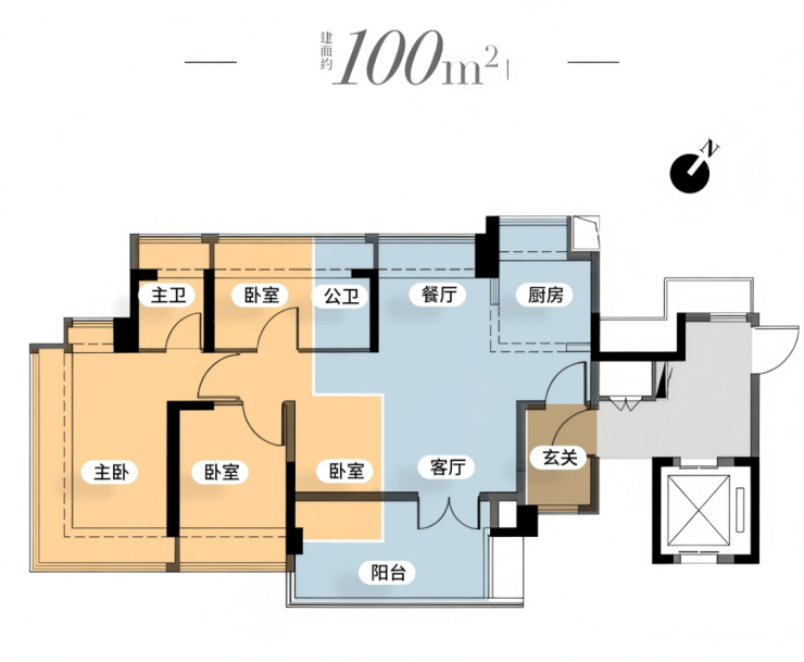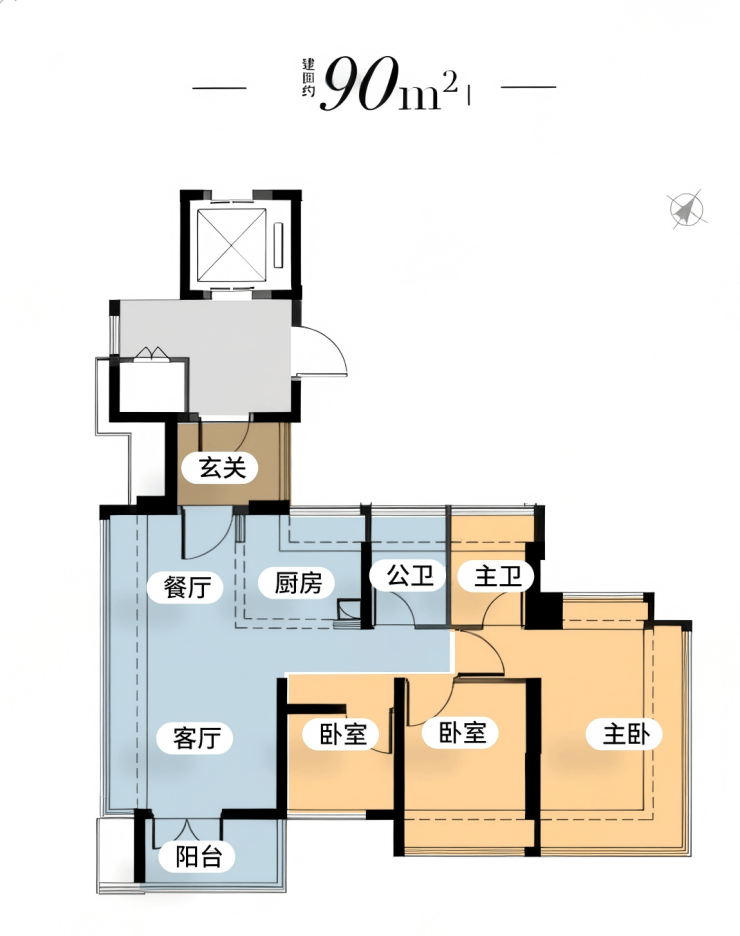 飞机户型,两个次卧在客厅两侧,方便与长辈同住,并预留了独立玄关空间。