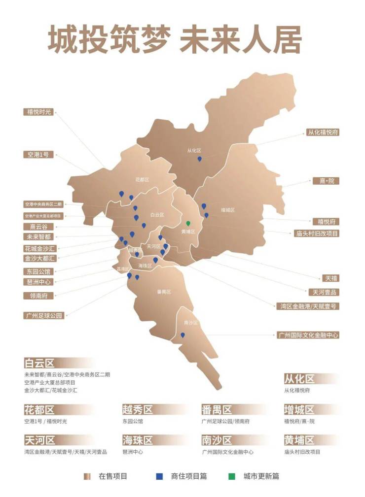 广州城投地产作为广州城投集团旗下地产品牌,秉持良好基因及优厚实力,践行“城投筑梦 未来人居”的品牌定位,从人居住宅到商业综合体,从商务办公到城市更新,打造了一系列覆盖人群广、产品多元化、标准规范化、硬件智能化的地产项目,用更高标准与更大力度,实现人们对美好生活的向往。