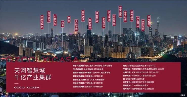 天河智慧城汇聚阿里巴巴、网易、酷狗、小鹏汽车等2500多家科技企业、1000多家高新技术企业,构建八大产业集群,2023年总收入达1341亿元,引进20多万技术人才,“广州硅谷”孕育而生,成为湾区科创精英宜居宜业之地。