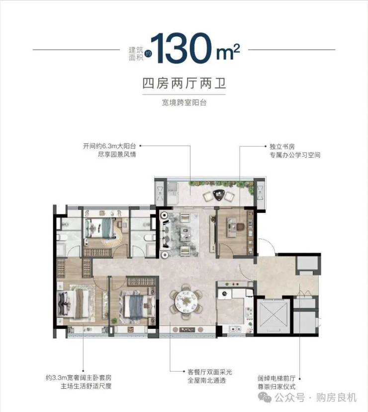 建面约104-168㎡纯改善四房,朝南而居,南北通透,阳光清风常伴,满足品质改善需求。