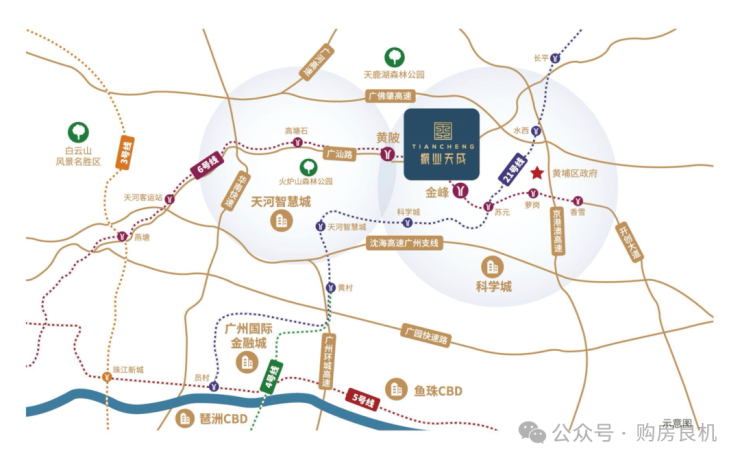城市轨交:20分钟步行,可达地铁6号线黄陂站、金峰站双站点,2站可达苏元换乘21号线,6站天河客运站。