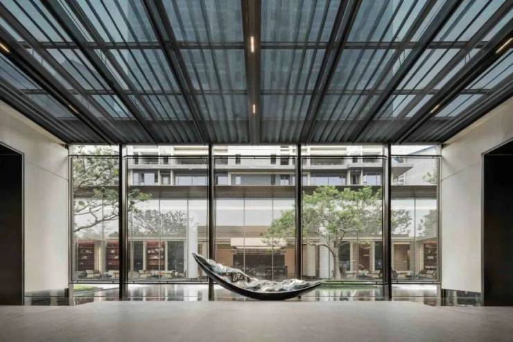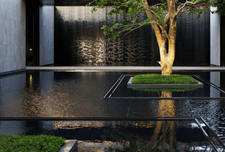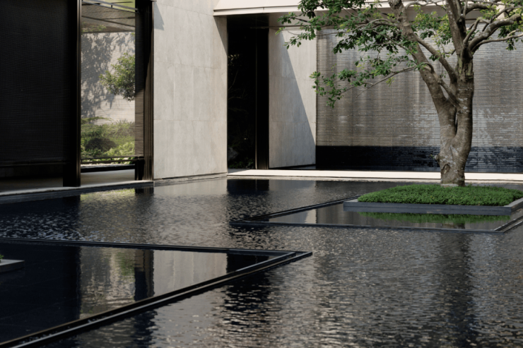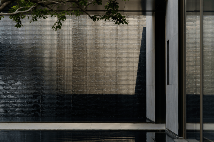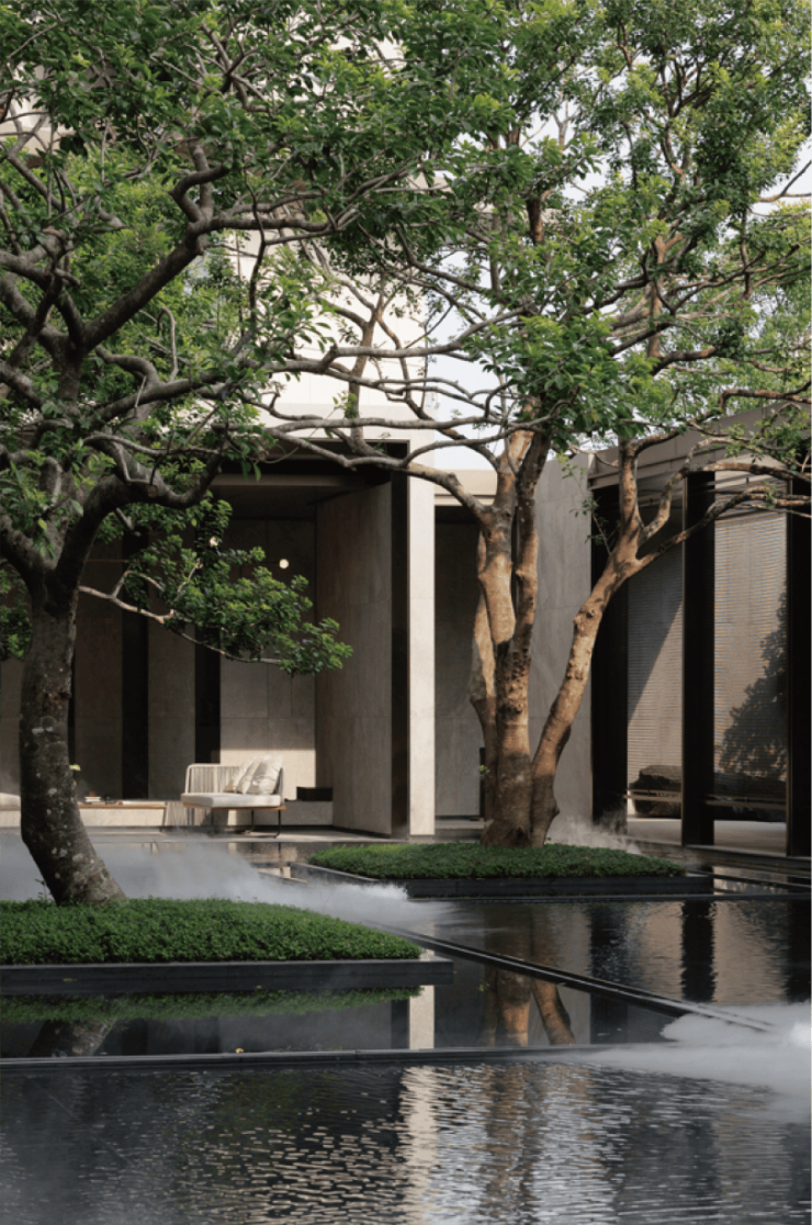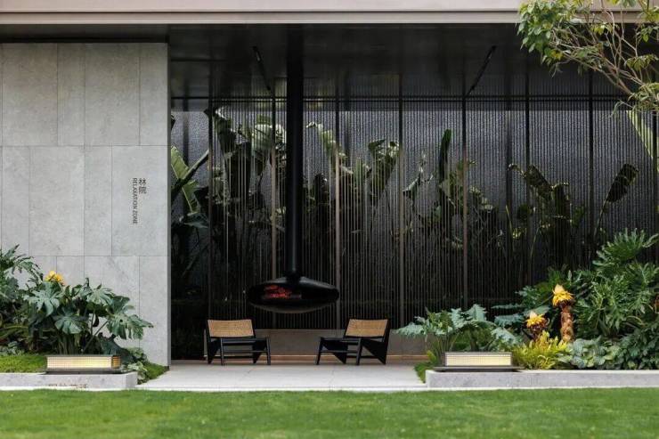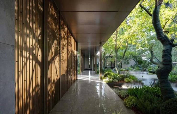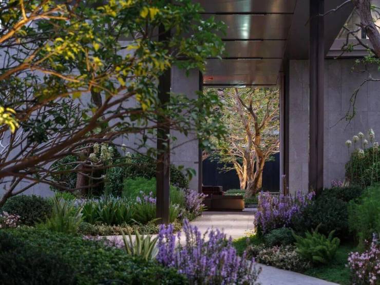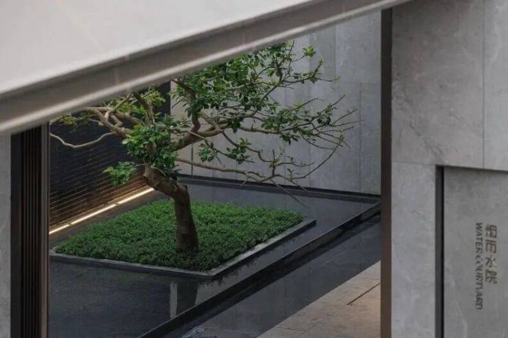 社区景观中,景观主轴的幕墙以石材为核心基底,搭配灵动流水造景,天然肌理在水光折射下呈现丰富层次,与“松湖印象”主题景观形成巧妙呼应。石材的厚重质感与周边绿植、天光和谐相融,每一次凝望都成为与松湖风光的深度对话,让“自然融于生活”的理念直观落地。