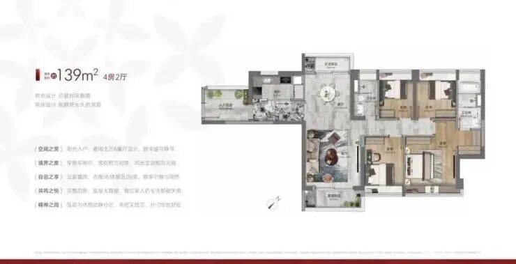 建面139平四房两卫,独立入户花园,大客厅,南北对流双阳台设计,主卧套房带衣帽间