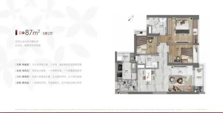 建面87-89平三房两卫,带主套设计,89平四开间朝南,三个房间带有大飘窗