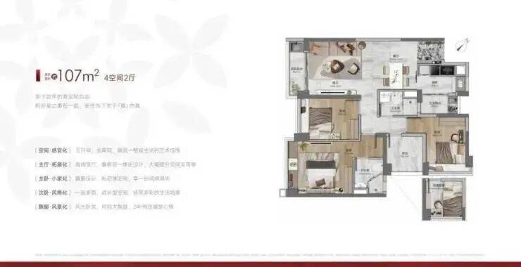 建面107平四房两卫,五开间朝南,经典竖厅设计,餐客厅一体化,每间房都有赠送大飘窗