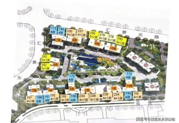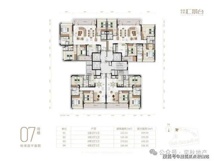项目由14栋12层小高层组成,产品涵盖123-352㎡三至五房,共8类户型,户型实用率约82-84%