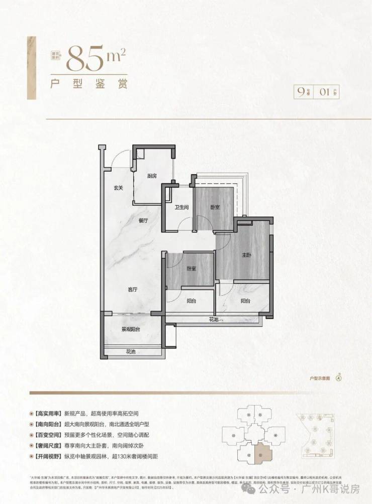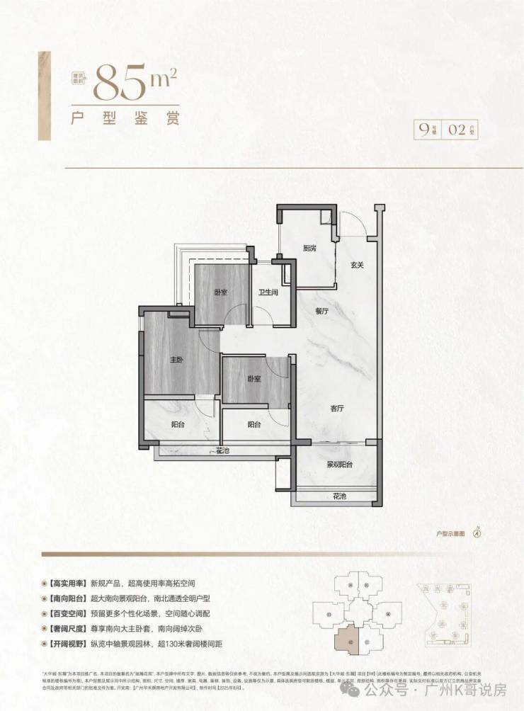 • 85㎡3房2卫(纯南向望花园):130米楼间距,采光视野绝了!抵得上旧规100平,还没小房间憋屈;