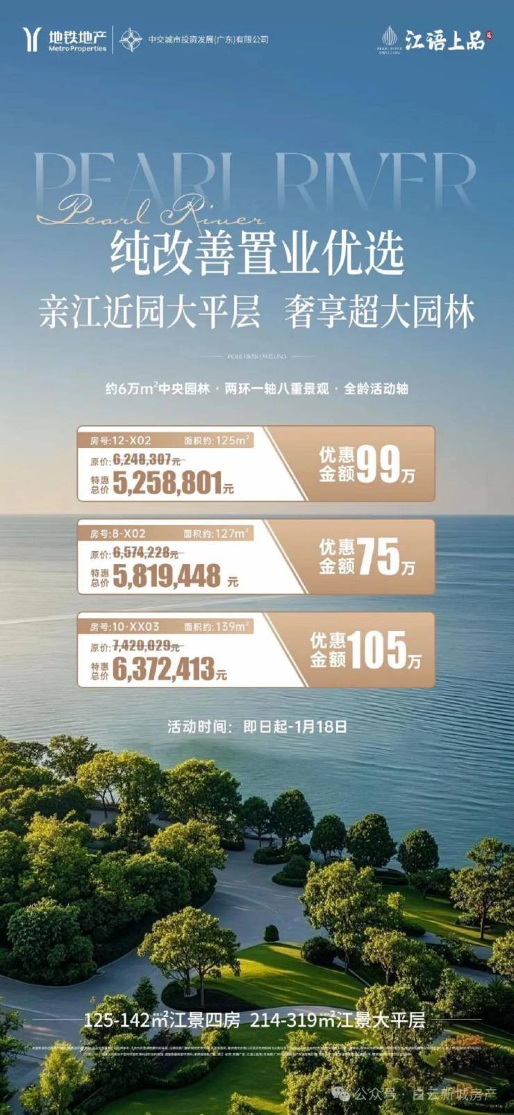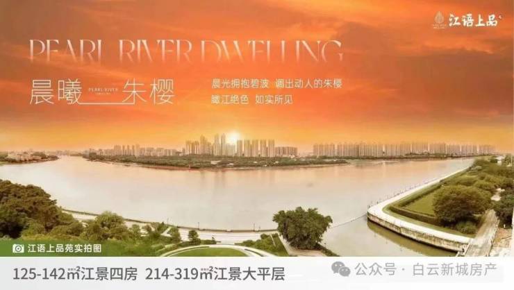 户型设计以四房为主,面积从125㎡到313㎡,户型方正,南北通透,配有大面积阳台,尽享珠江江景。前排为6栋8层高的超大户型小高层洋房,后排为9栋26层高的高层洋房。近期新推出了216㎡-319㎡大平层,实体板房已经开放。