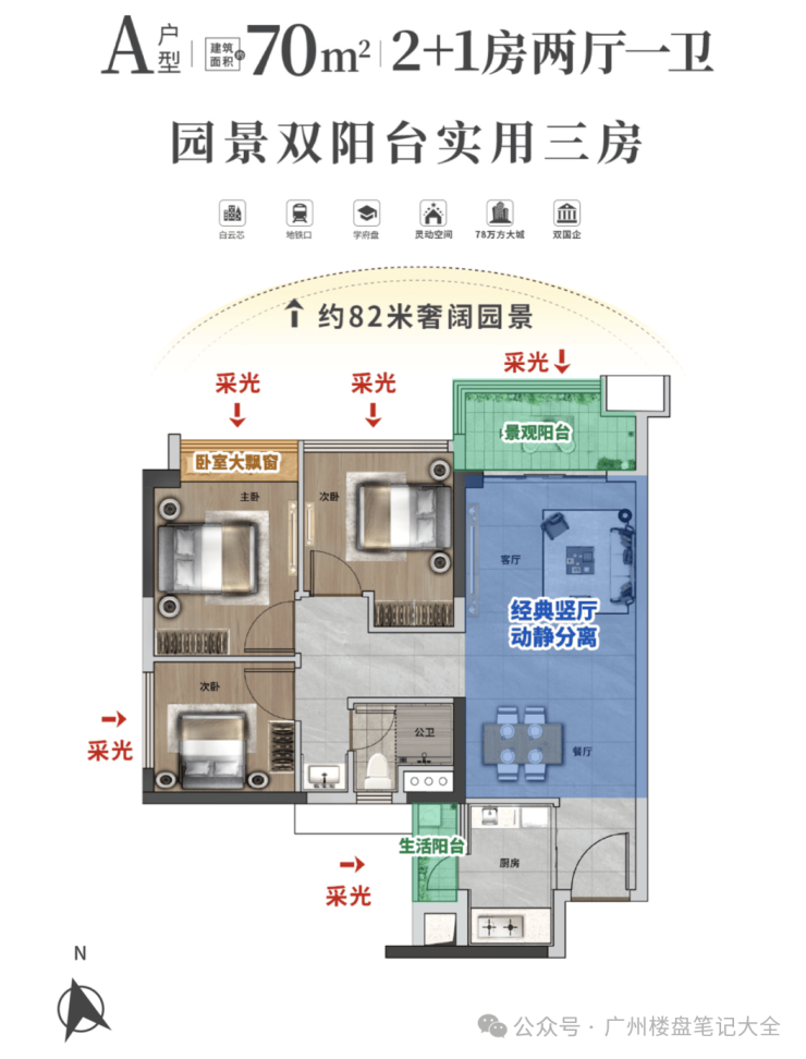 👇建面约70㎡丨双阳台园景三房🔘双阳台设计,视野开阔,畅享园林美景🔘南北通透,动静分区,作息互不打扰🔘实用三房,主城置业性价比优选