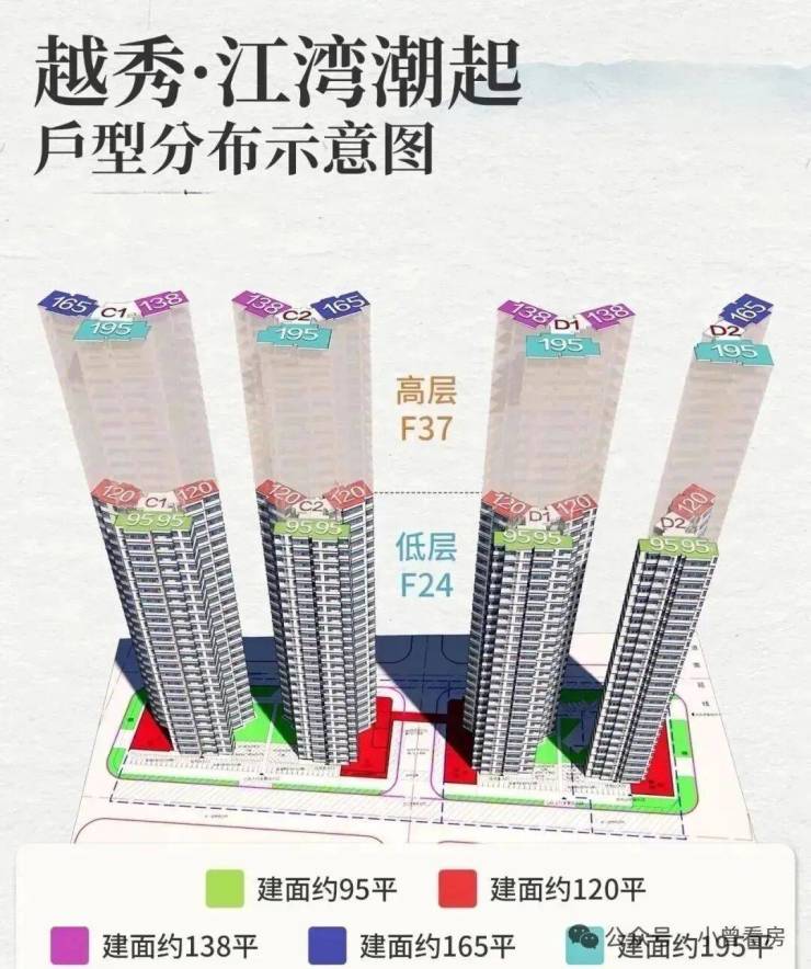 项目共规划4栋住宅楼,均为37层,分高低区设计,而且梯户比跟户型都各不相同: