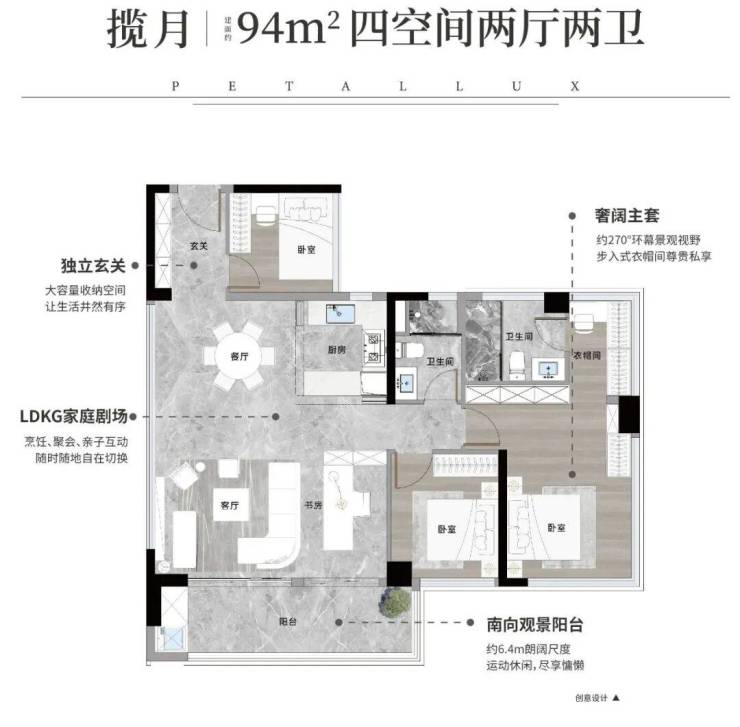 ·94㎡四空间以“6.4米IMAX阳台+灵动空间”构建家庭成长模型,主卧套间的步入式衣帽间让女主人的换季衣物有了专属领地,270°环幕飘窗则将园林景色框成流动的画。