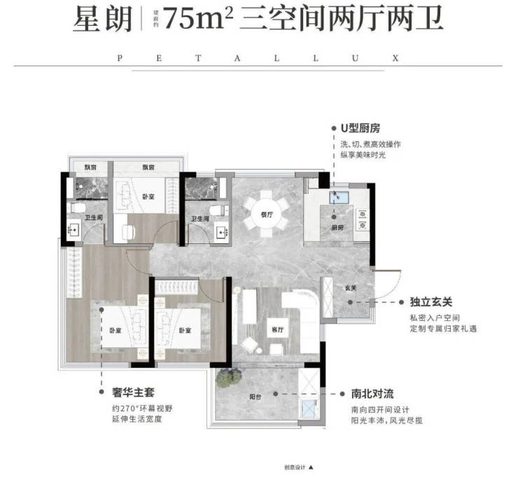 75㎡三空间做到南北对流+四开间朝南,清晨阳光透过四扇朝南窗户洒满每个房间,传统100㎡才有的功能密度,在75㎡空间里实现了完美压缩。