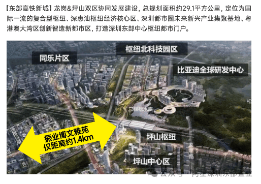 以坪山高铁站为中心发展枢纽商务、创新研发、生活服务。总规划面积约29.1万k㎡,其中龙岗16.4万k㎡,坪山12.7万k㎡,打造为深圳东部中心枢纽都市门户。
