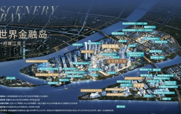 为实现大湾区城市会客厅的畅联,项目北侧打造过江人行桥(规划中),东侧打造过江隧道,实现明珠湾金融岛、科学岛的双岛资源共享,打造湾区中央商务区;深业颐泽府作为国际金融岛唯一“府”系备案项目,坐拥双岛繁华配套,实至名归的“岛中岛 世界府”。