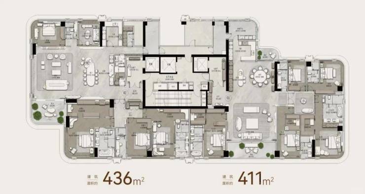 户型格局:约411㎡户型拥有8米×15米的宽阔客餐厅,实现了完美的动静分区。约436㎡户型则设计了10米×12.5米的奢华大方厅,气场十足。