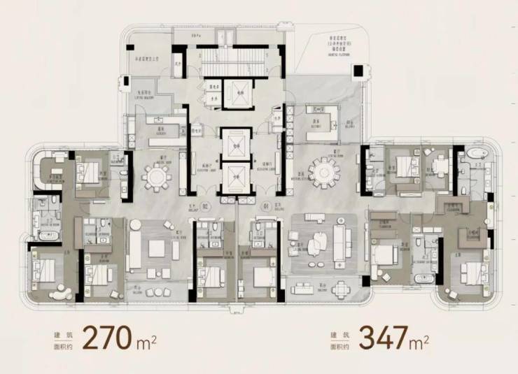 所有户型均实现南北对流双阳台,通风和采光效果极佳。约270㎡户型客厅面宽达5.7米,空间感十足。约347㎡户型则拥有近8米×11.7米的豪华直厅。奇数层的单位还额外赠送约32㎡、层高6.6米的通高平台,附加值非常高。