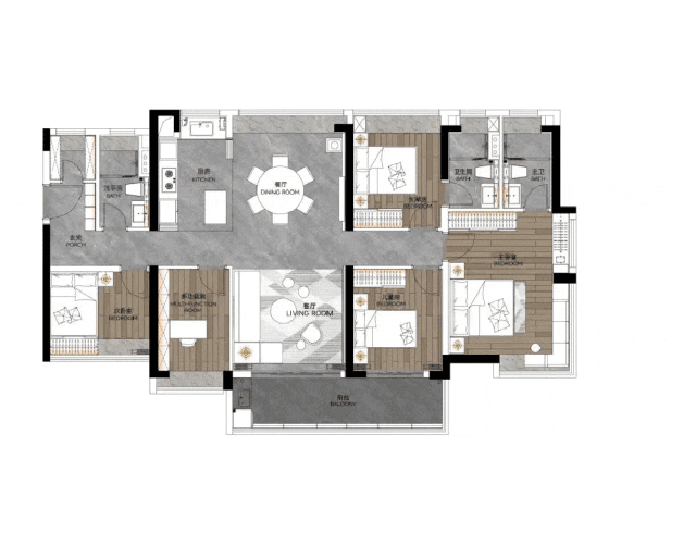 下面是121方4+1房,客厅会比89方大很多,如果需要5个房间也可以隔开,不需要的话就把多功能房墙体打通,客厅空间就会大很多!