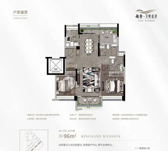 建面约96㎡超高层三房,3梯6户配置,总价270万起,主要为33层以上房源,部分户型可远眺湖山景致;