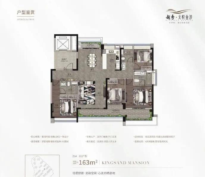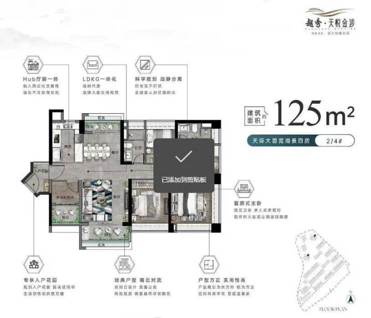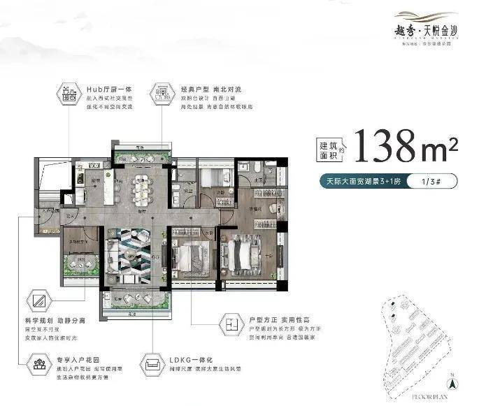 建面约125㎡四房/五房,南向三开间搭配6.85米阔景阳台,270°L型观景阳台直面山湖,适合多孩家庭或三代同堂;