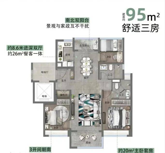 建面约95㎡小高层三房两卫,2梯2户板式设计,南北通透,双阳台区分生活与景观,三开间朝南近10米南向面宽,卧室飘窗全赠送,空间利用率高;