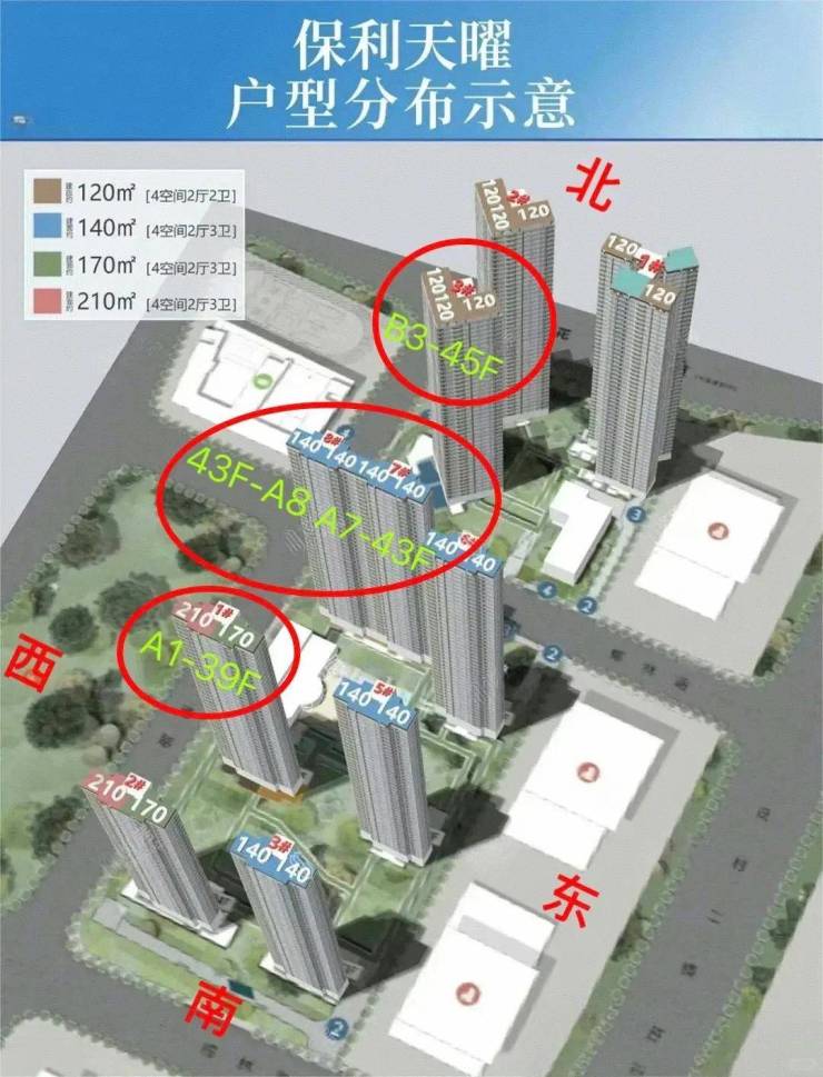 本次开盘推的是南区板楼,专梯专户,其中A1栋为约165/210㎡户型,A7/A8栋为约140㎡户型;以及北区B3栋塔楼,2梯3户,全约120㎡户型。