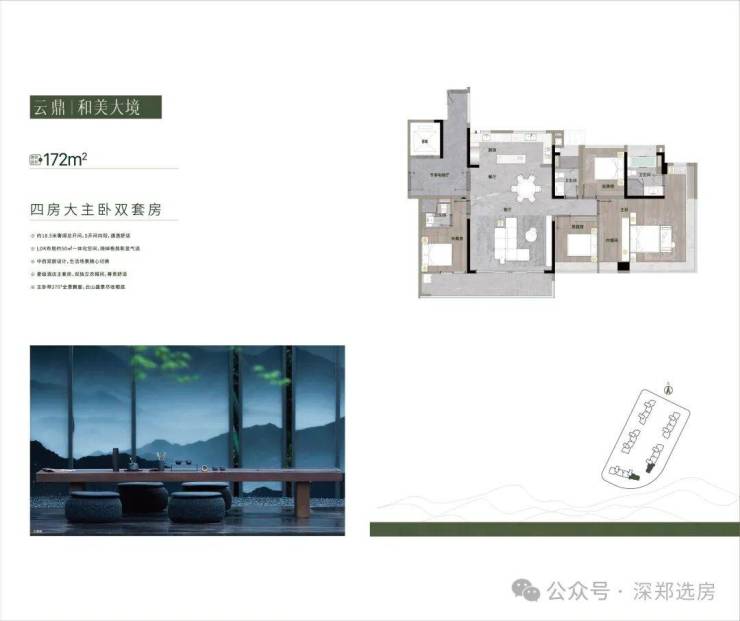 专梯专户山居环幕MAX平层,视野开阔,揽一线云山美景,低17展低密居件环境非常舒适,仅319户。