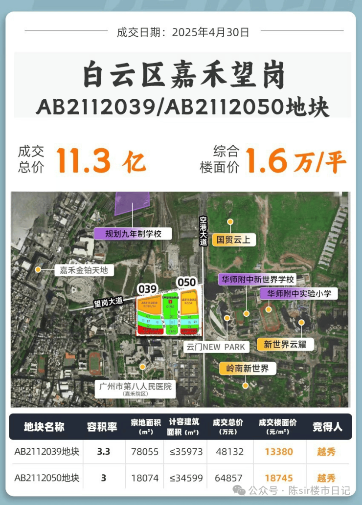2025年4月30日土拍的嘉禾望岗两宗地,吸引了国贸、越秀、龙湖、保利4家房企参拍,最终都由越秀拿下。