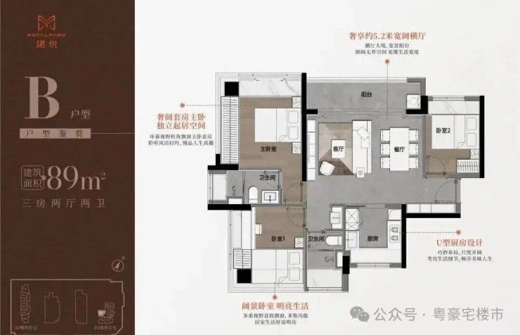 B户型西北向仅29套,大横厅户型,5.2的客厅开间,双龙抱珠户型,使用率98%